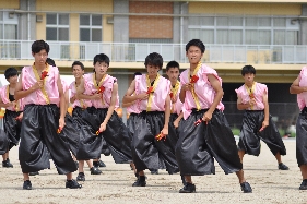| 赤団。夏の日差しの下、鮮やかな衣装が映えます。衣裳とマッチした、かっこいい振り付けです。 | 翻した扇が絵になります。 | 紫団。気合が伝わってきます。太鼓を用いた演出も、パフォーマンスに華をそえていました。 |
