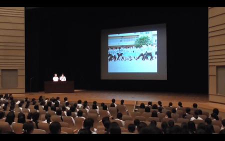 本校の生徒会長・副会長からの説明や、放送部が制作したVTRをご覧いただきました。 |