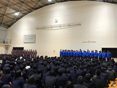 両クラブの選手たちを全校生徒の大きな拍手により迎えました。生徒会長と学校長による激励の言葉の後、各クラブのキャプテンより全国大会に向けた決意表明を行いました。