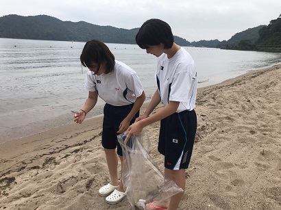 | 開校式で校長から体育科へ科旗が渡されました。 | 国民休暇村に到着。今日と明日、このビーチにお世話になります。恒例の清掃活動。 | いよいよ入水、その前に準備運動。 |