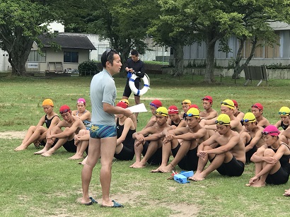 | 人員確認、無事終了。 | 最後に集合写真。明日はいよいよ遠泳です。 |