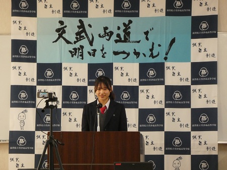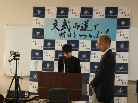 最初に剣道部女子主将から、過日行われた滋賀国スポ剣道競技において少年男女とも準優勝という、すばらしい結果報告がありました。その後、選手代表から力強い決意表明、校長、生徒会長より激励の言葉がありました。