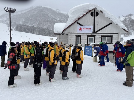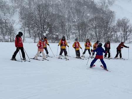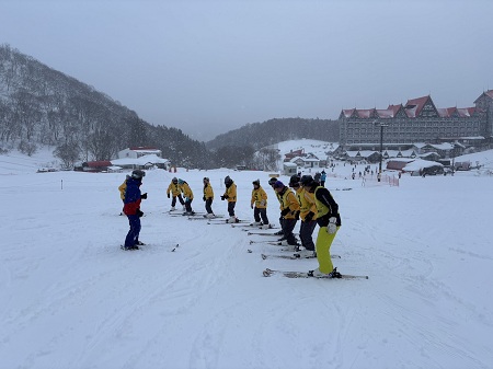 実習初日は少し雪がちらついていましたが、無事に予定通りのプログラムを実施することができました。開校式を終え、それぞれの班に分かれての実習ではレベルに応じた基本スキルの習得を目指し、切磋琢磨しました。スキー板の扱い方や転び方、滑り方少しずつ慣れていった様子でした。